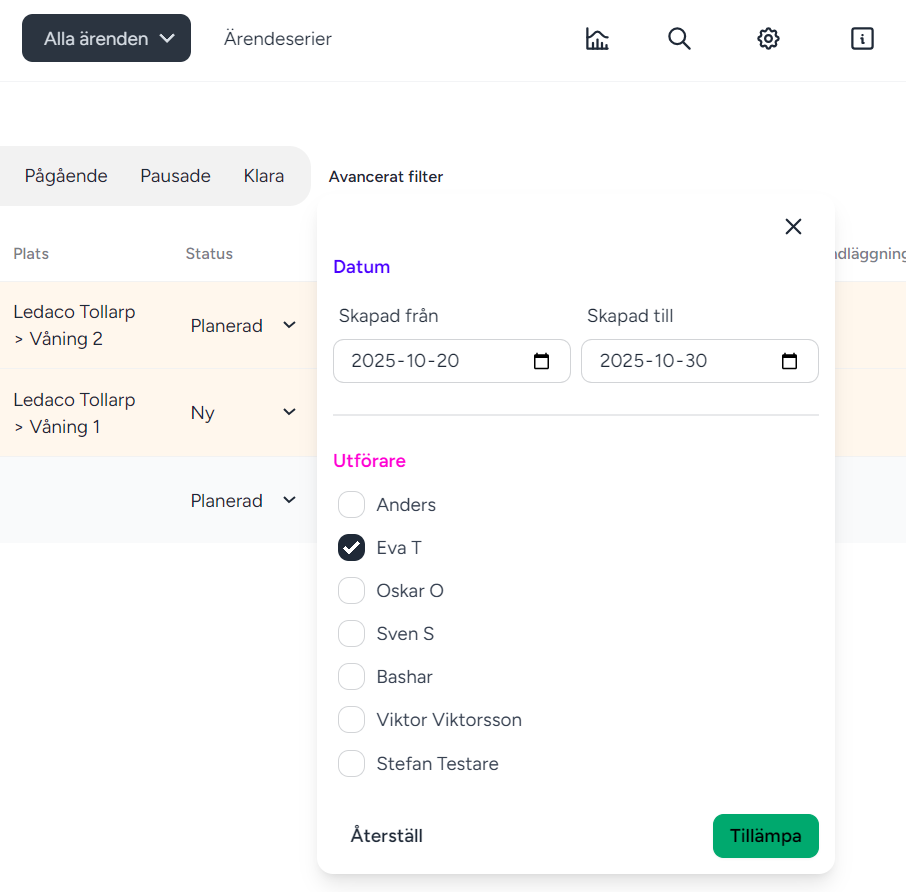 Avancerat filterFiltrera ärendelistor baserat på tidsperiod och utförare för att snabbt hitta det du söker.