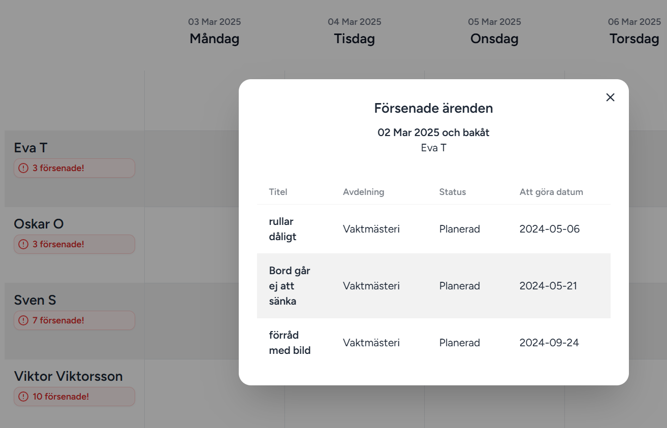 Antal föresenade ärendenPlaneringsvyn visar nu antalet försenade ärenden, och du kan klicka för att se en lista.
