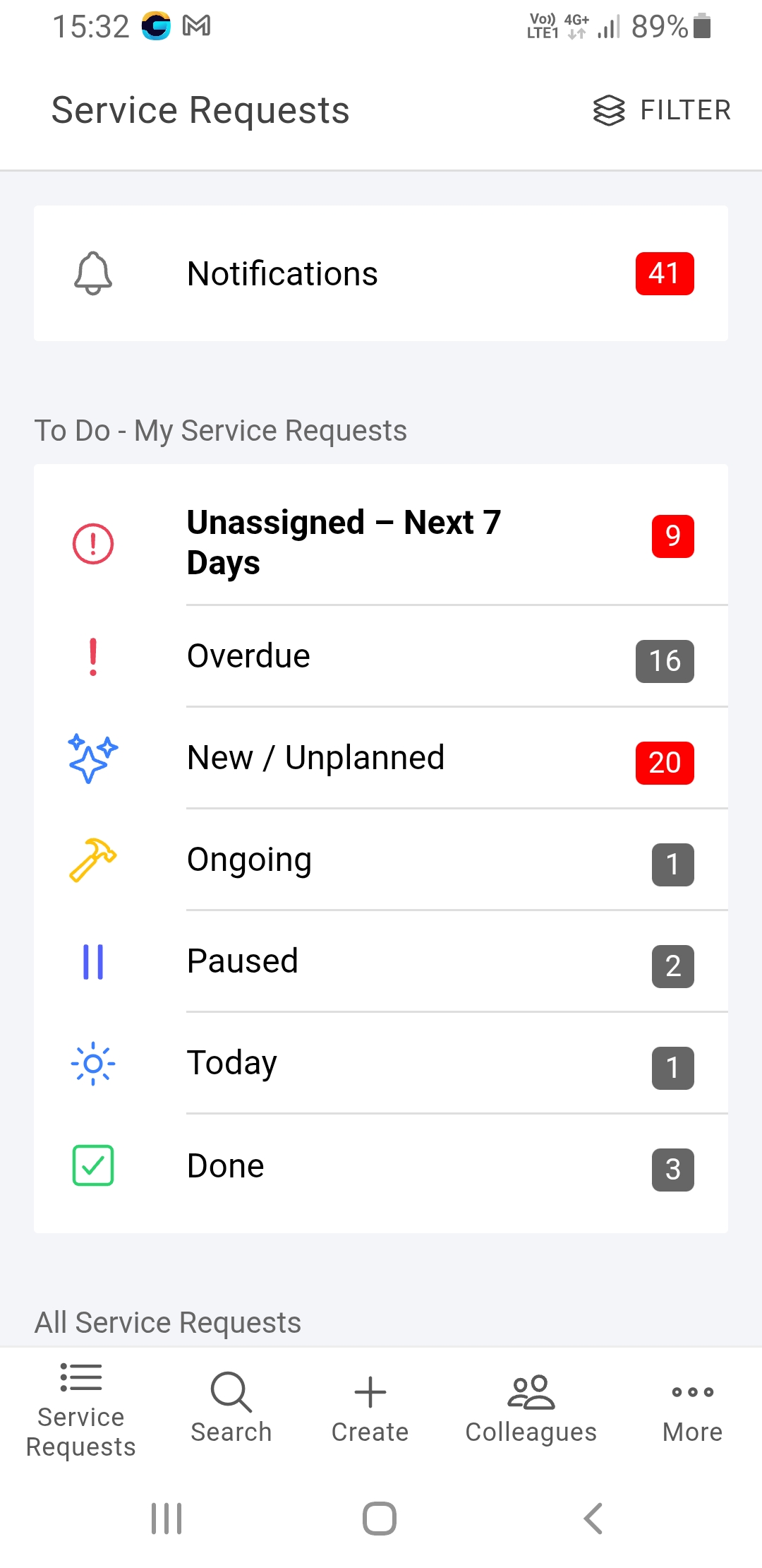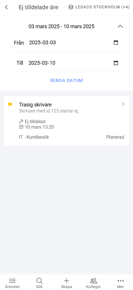 Datumintervall för ärendenAppen visar nu datumintervall för kommande, planerade och ej tilldelade ärenden, vilket gör det möjligt att filtrera på ett specifikt datum i listan.