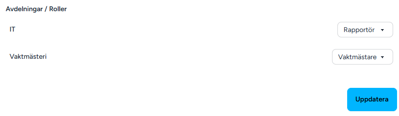 Nu stöd för olika behörigheter per avdelningDet är nu möjligt att tilldela olika behörigheter beroende på vilken avdelning en användare tillhör. Det innebär att en person kan ha olika roller i olika sammanhang – till exempel kan en användare ha rollen Vaktmästare inom avdelningen Vaktmästeri, samtidigt som samma person har rollen Rapportör inom avdelningen IT.