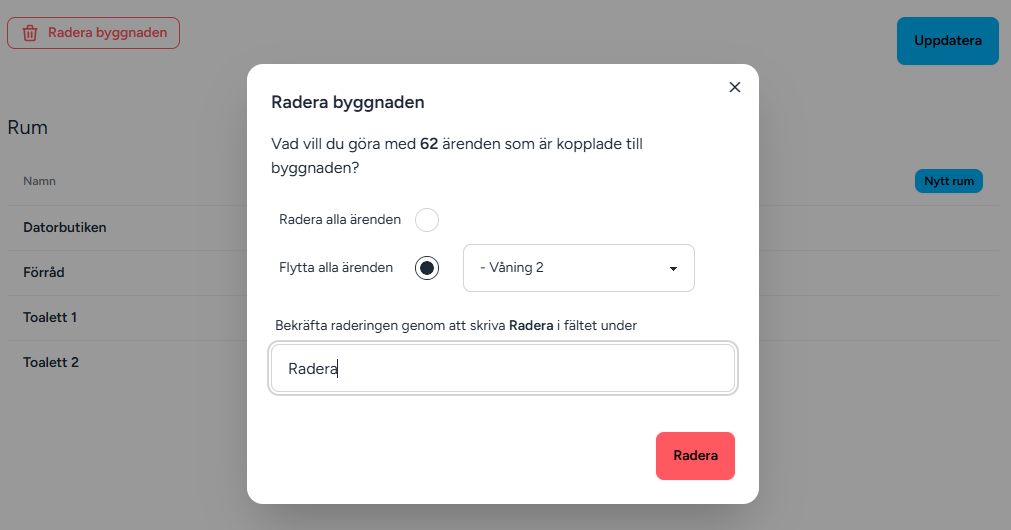 Radera byggnader/rumVid radering ges användaren valet att antingen flytta befintliga ärenden till en annan byggnad/ett annat rum eller att radera dem helt.