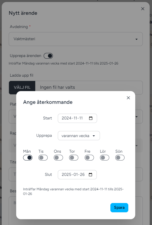 Återkommande ärendenÅterkommande ärenden är uppgifter som behöver utföras regelbundet över tid. För att hantera dessa kan du sätta ett start- och slutdatum, välja vilka veckodagar uppgiften ska utföras på samt ange hur ofta den ska återkomma med hjälp av ett intervall. Detta gör det enkelt att automatisera planeringen och hålla koll på uppgifter som kräver regelbunden uppföljning.